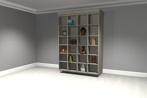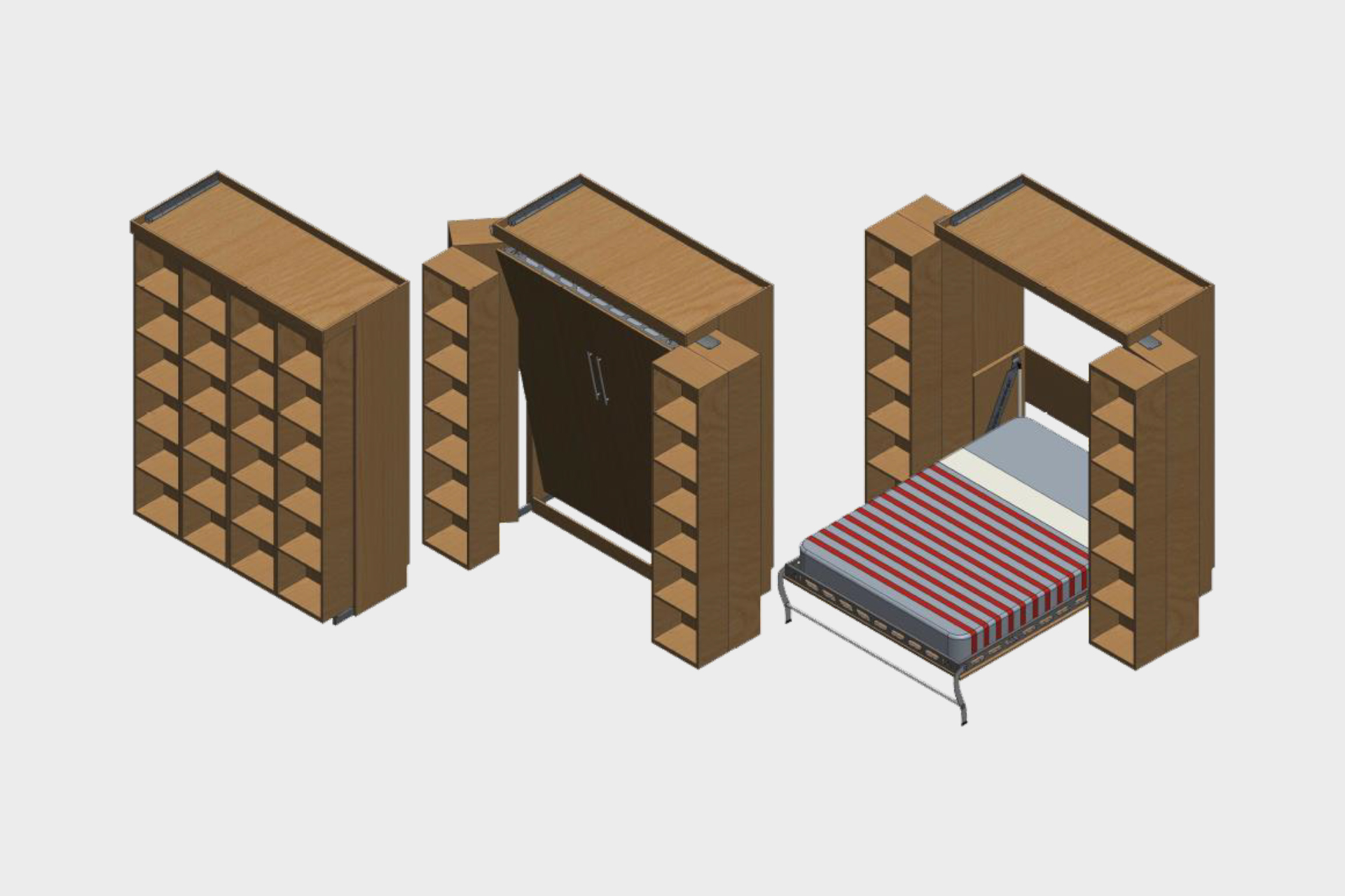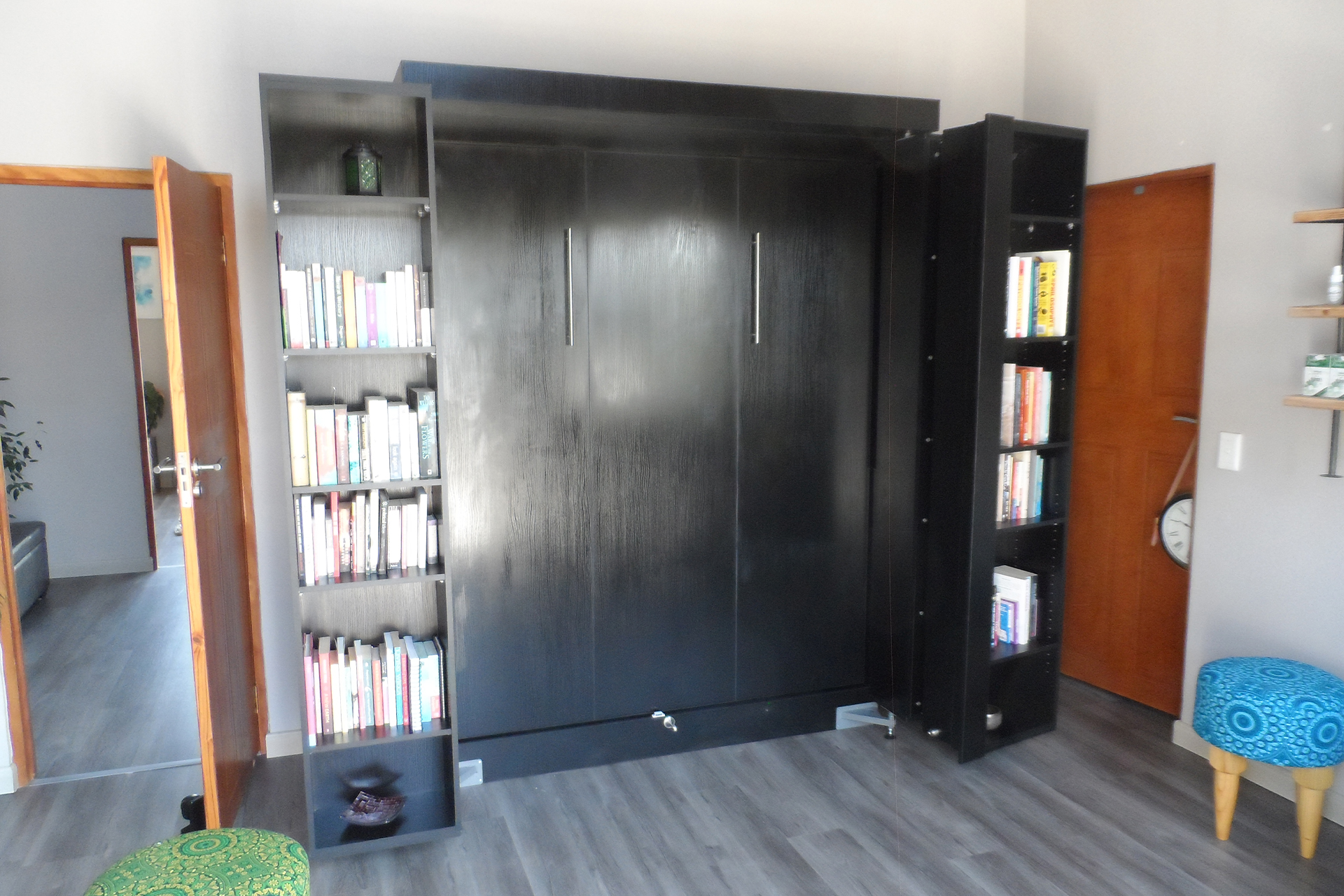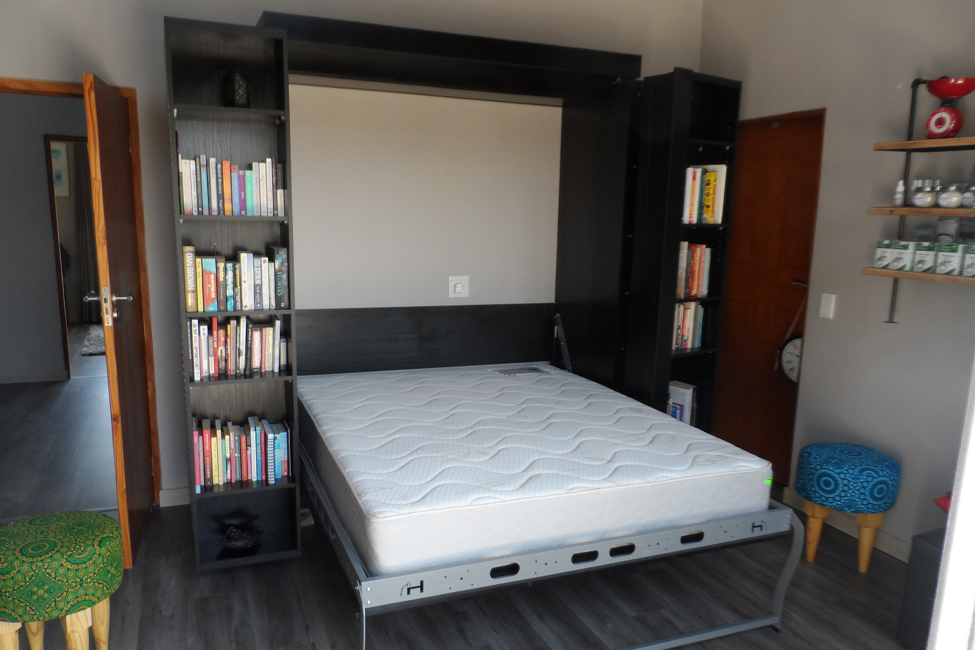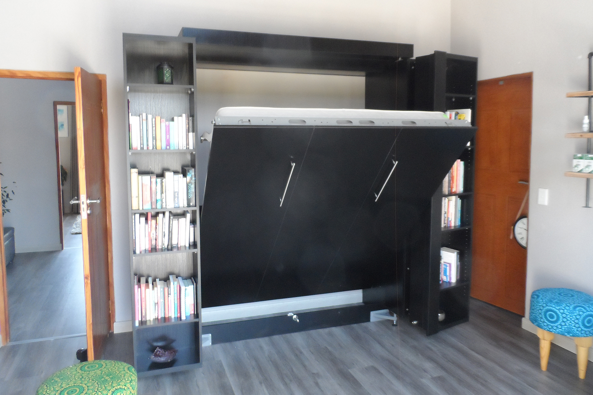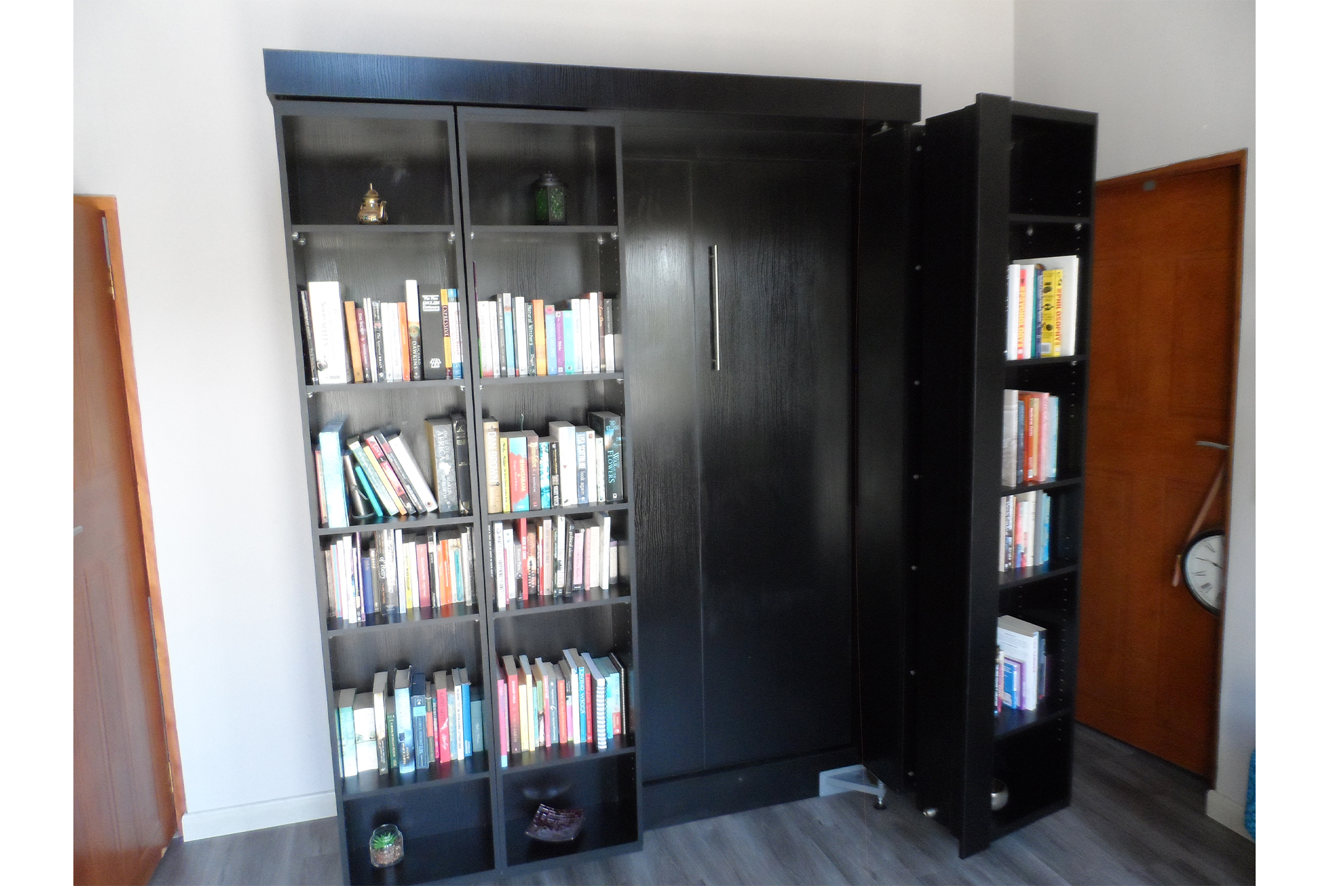 The Fleetwood library bed product has been developed to solve modern home space constraints focusing on the requirement for storage for books, curios, art pieces etc while having the convienence of an extra bed. This design is based on a book shelf / bed combination which provides sleeping and storage facilities within the same space. Using an intellegent mechanism the Fleetwood retains the book shelf in a vertical position enabling a swift book shelf-to-bed operation without having to remove items off the shelves.